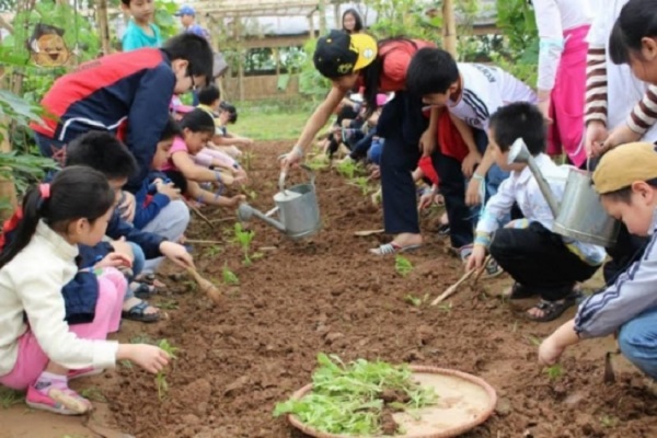 - Làm đất, trồng cây, tưới cây, thu hoạch rau (các bé 5 tuổi).