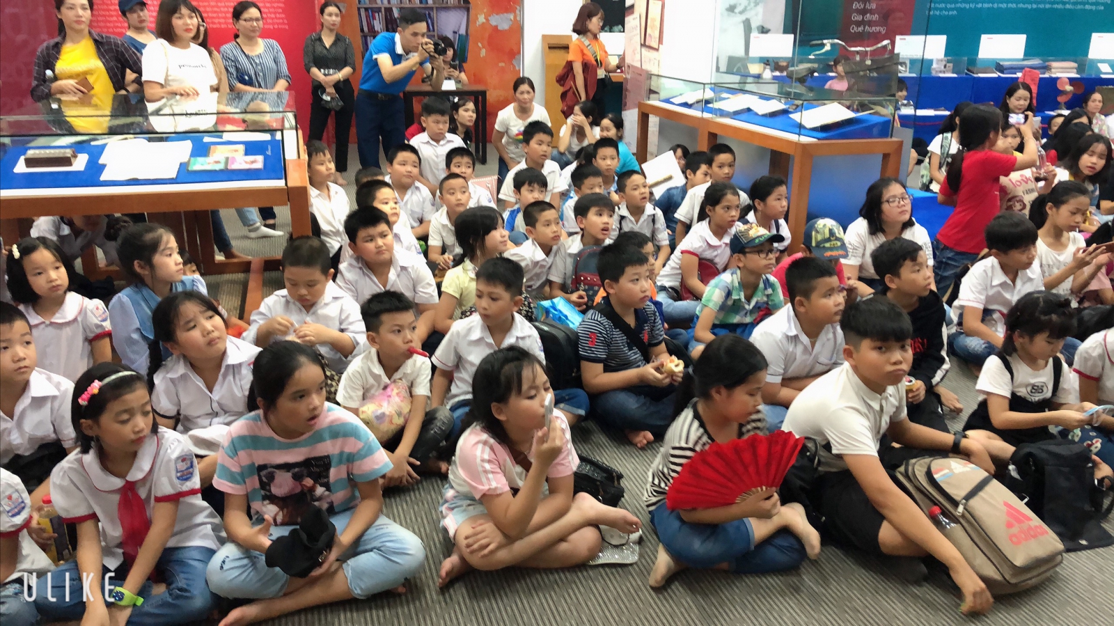 Các bạn học sinh chăm chú lắng nghe hướng dẫn viên giới thiệu về Công viên.