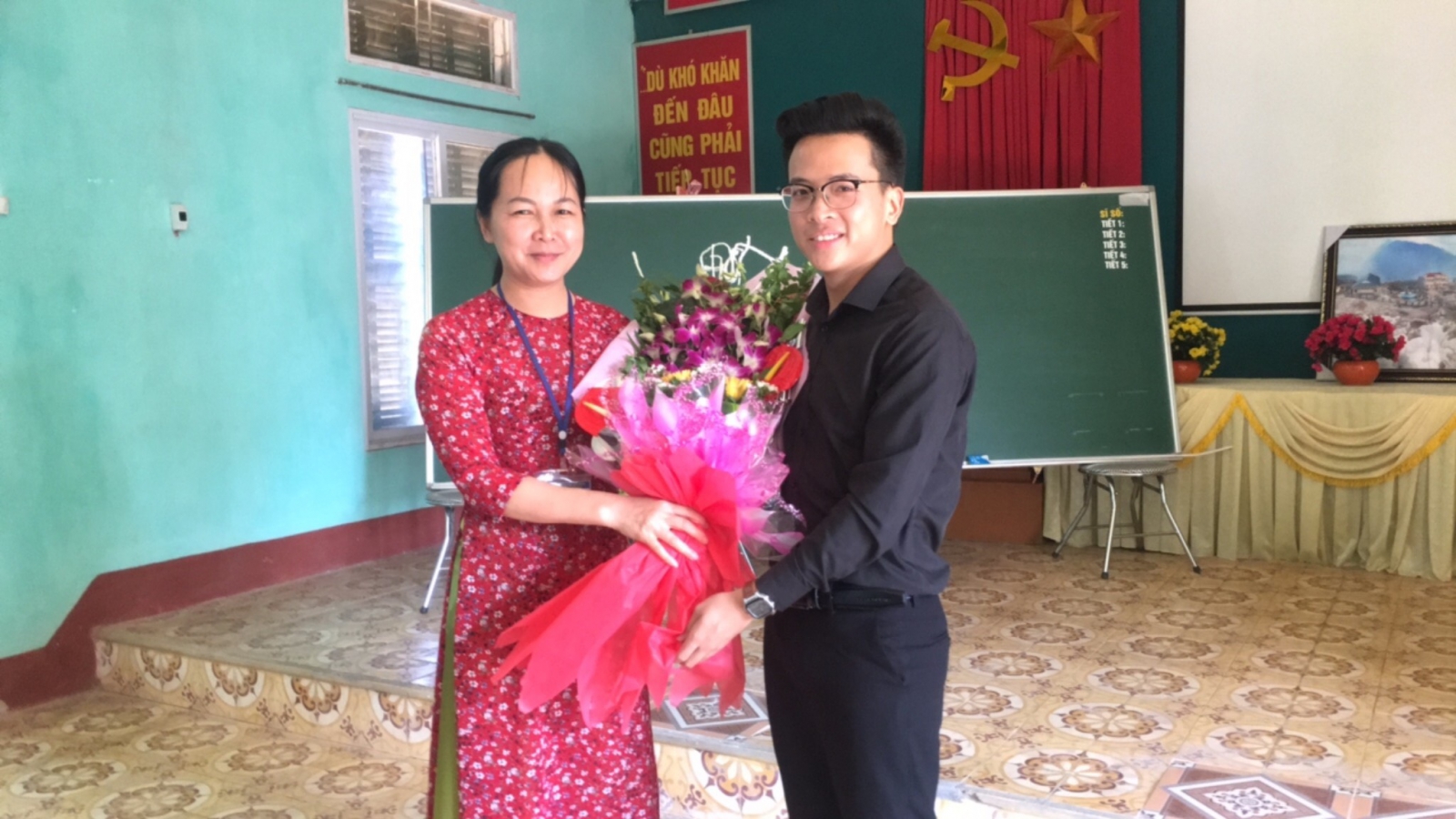 Cô Hoàng Lệ Châu Hà - Hiệu trưởng Trường THCS Sông Đà đã tặng hoa cho diễn giả Trần Quang Vũ.