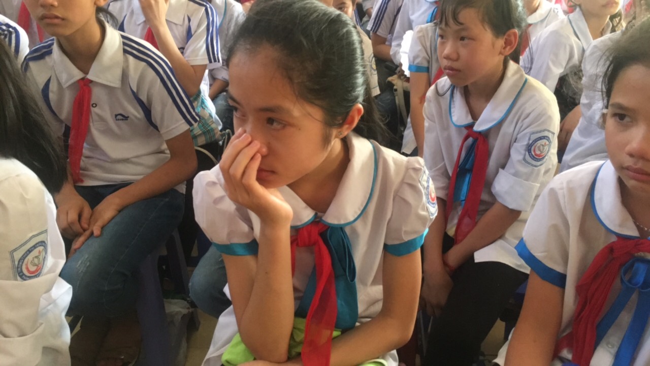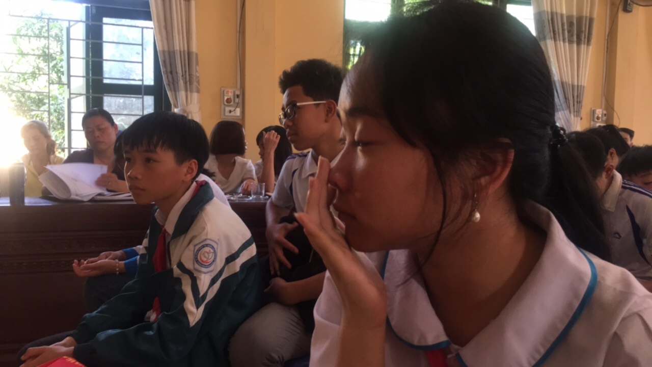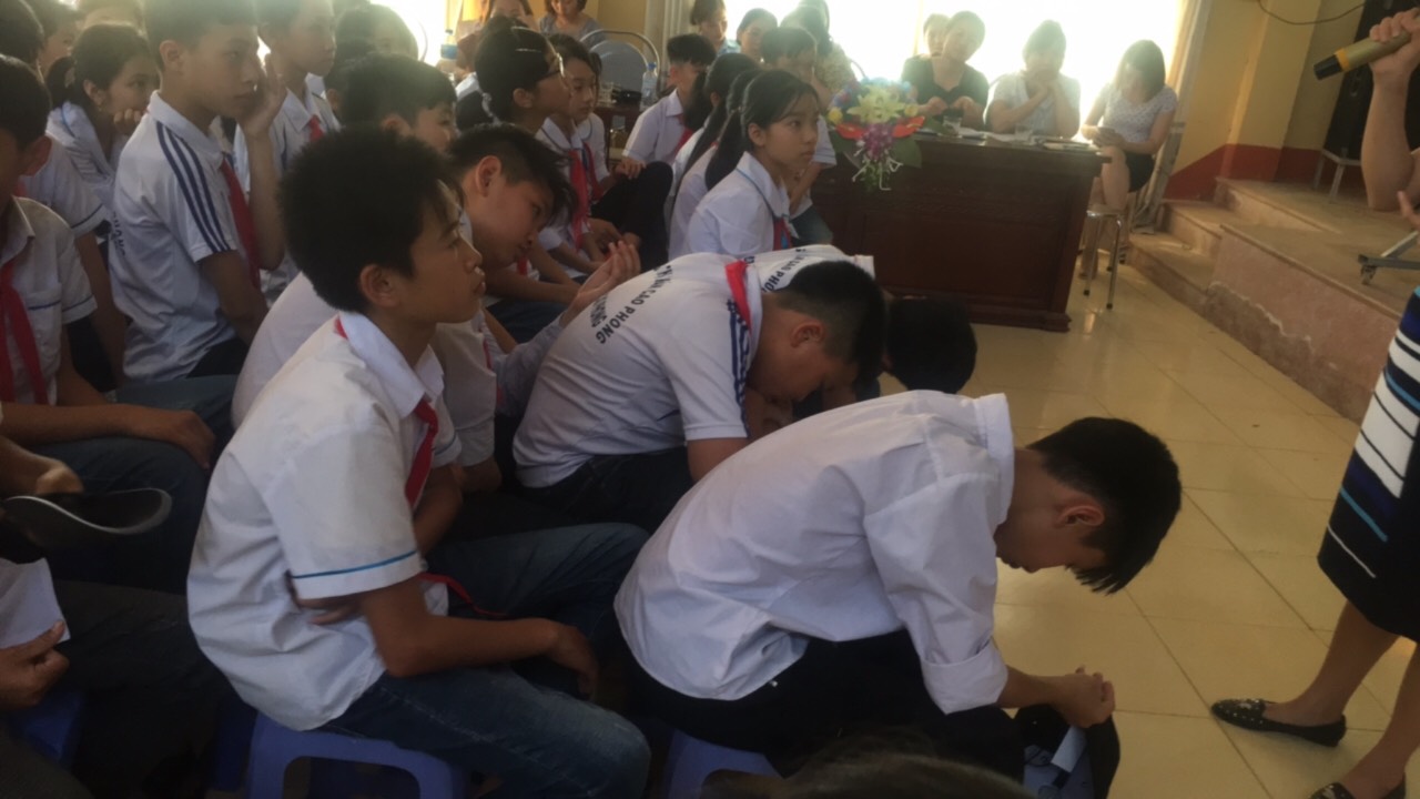 Các em HS rất xúc động khi nghe cô giáo chia sẻ về công lao sinh thành của cha mẹ.
