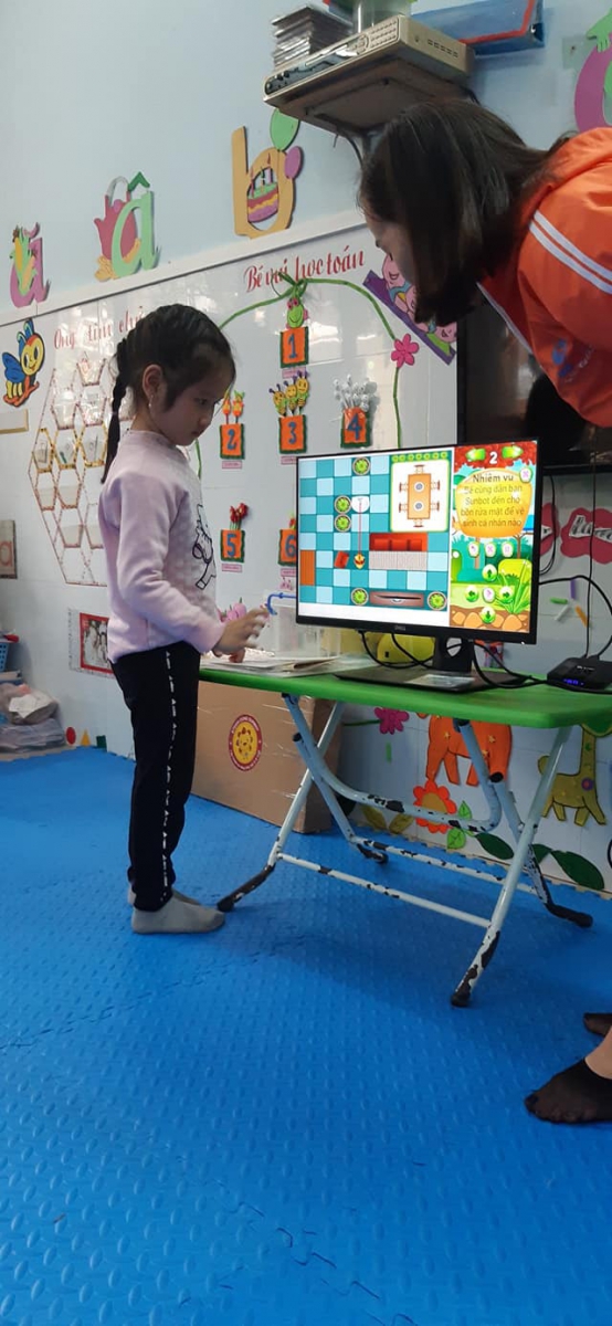 Trẻ lập trình đường đi của robot Sunbot trên máy
