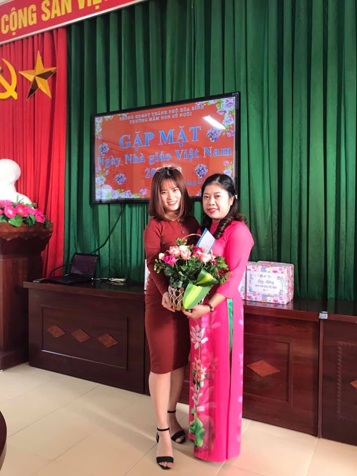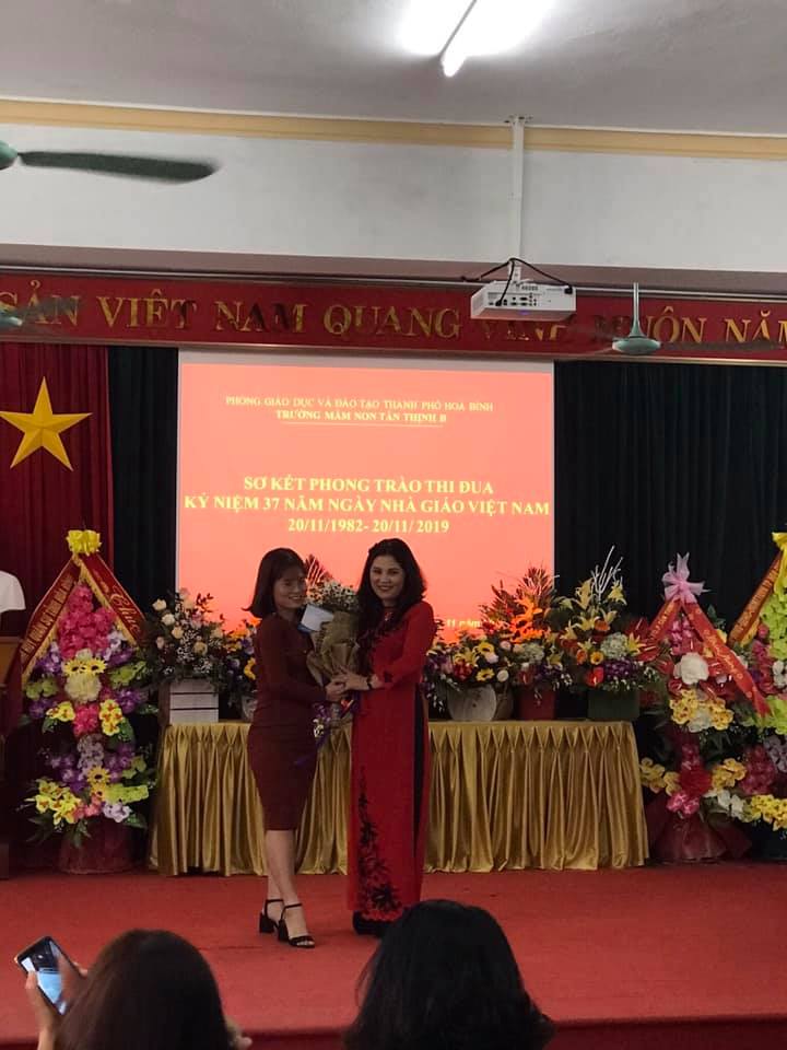 Cô giáo Hồng Nhung tặng hoa BGH nhà trường MN Tân Thịnh B.