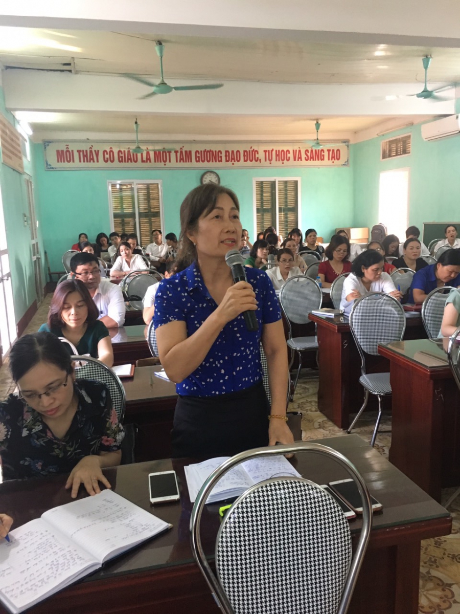 Cô Phạm Thị Hải Châu - HIệu trưởng trường THCS Lê Quý Đôn có ý kiến đóng góp và đưa ra câu hỏi.